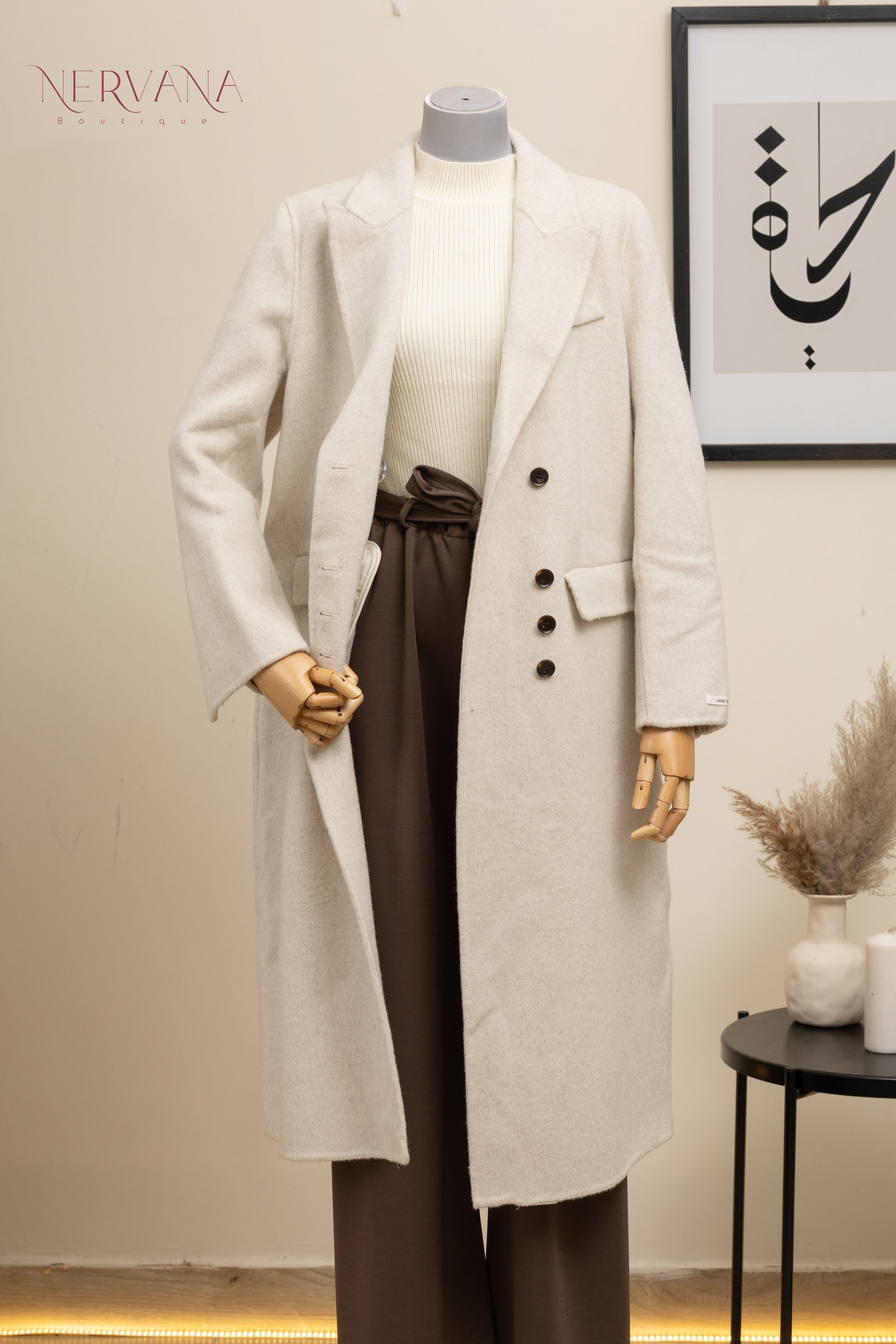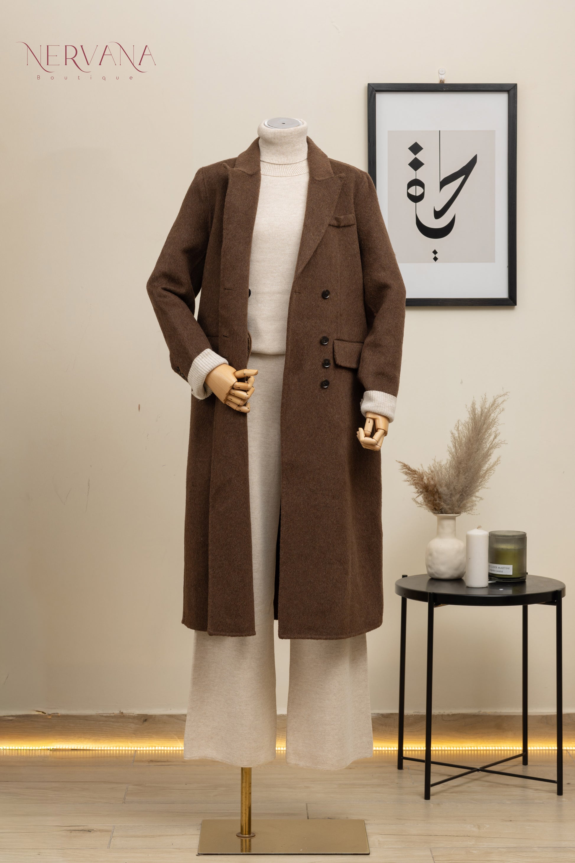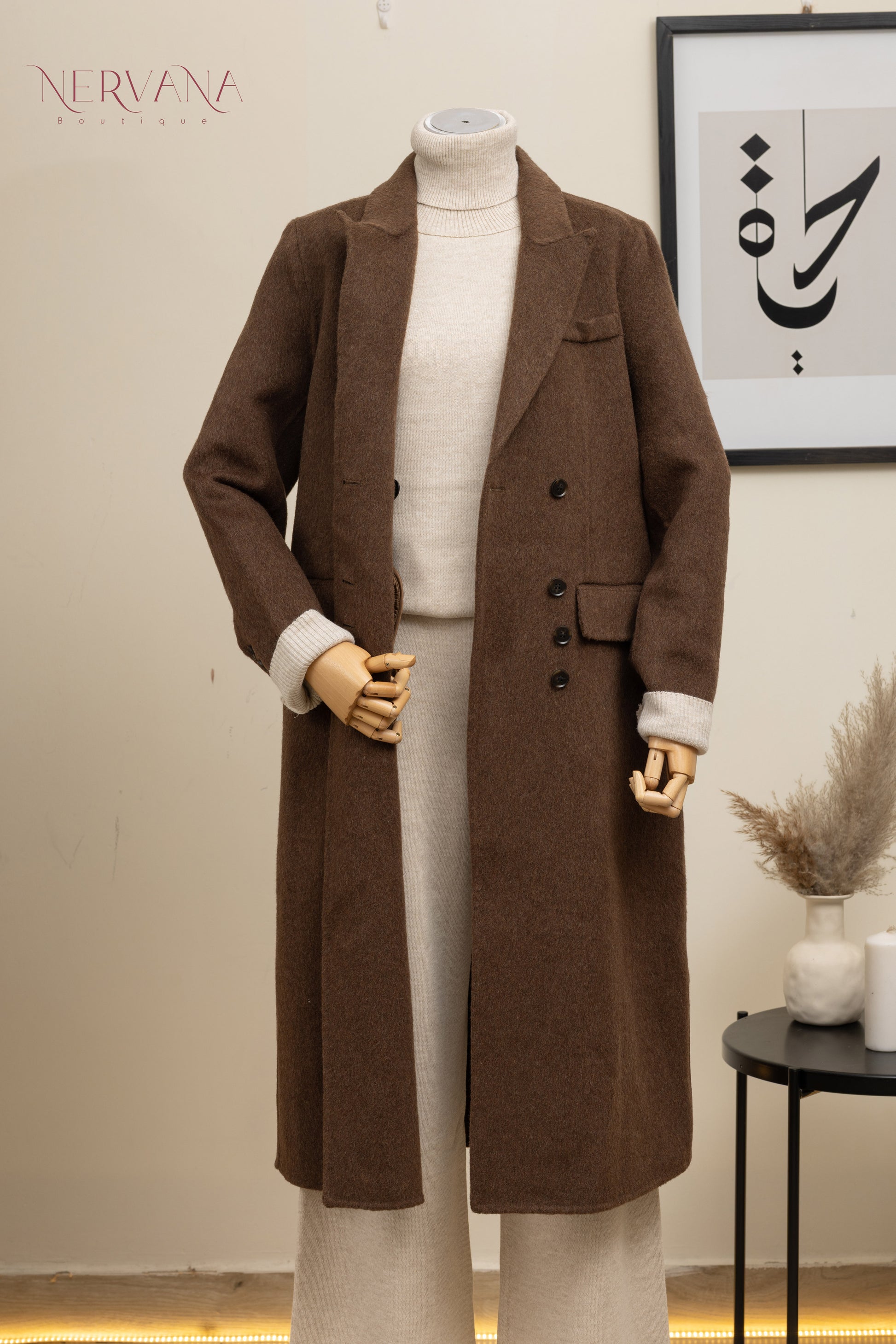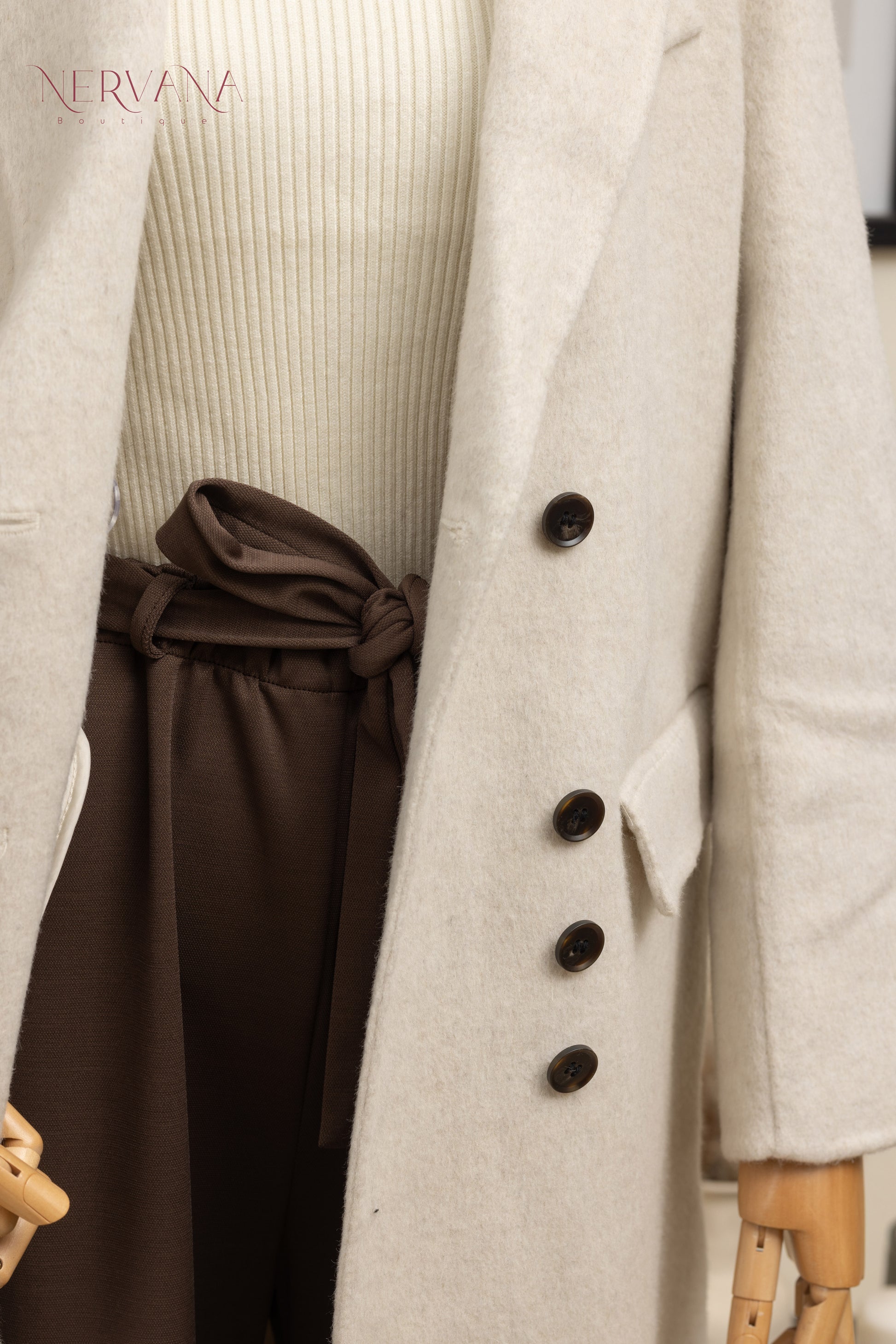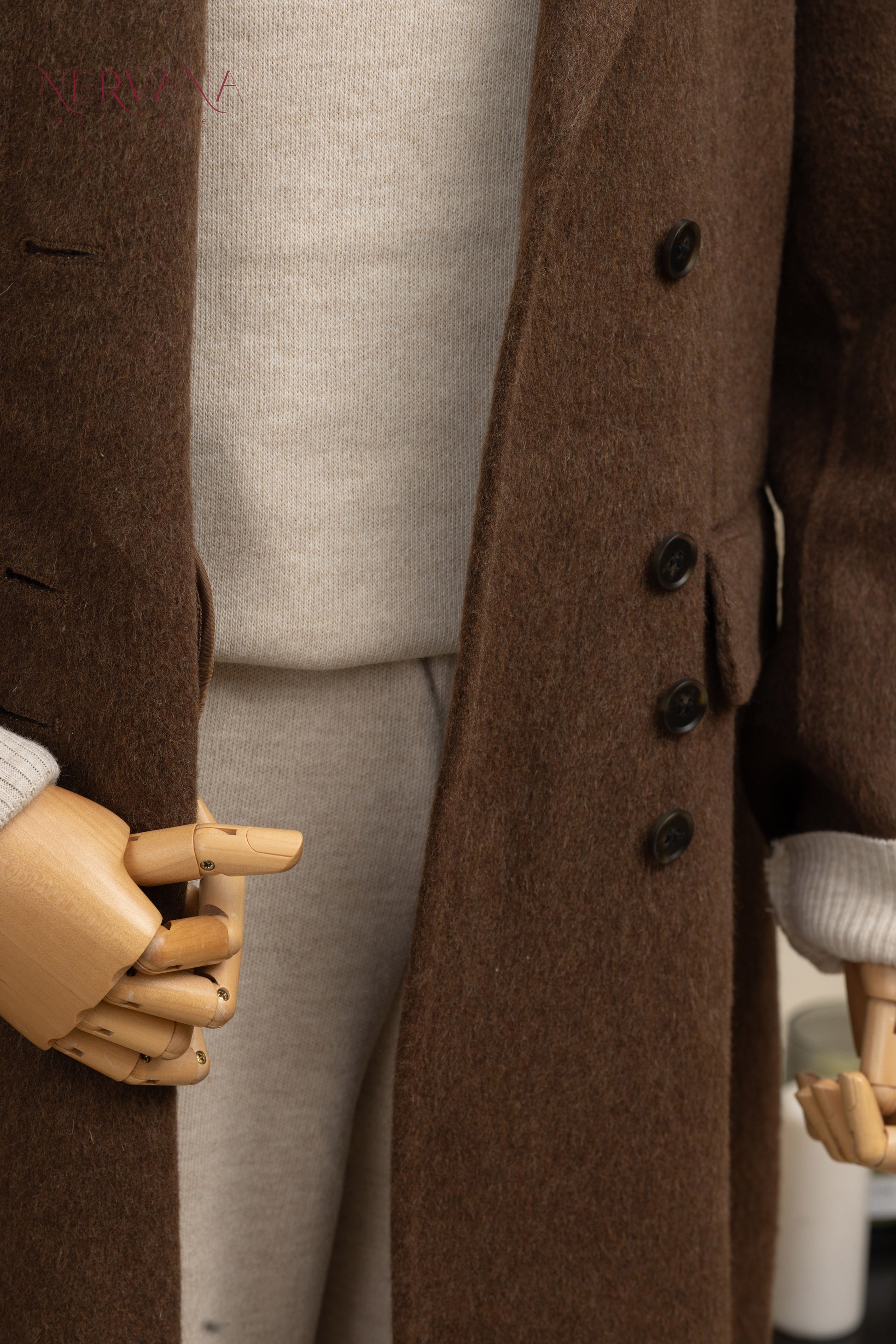 جاكيت جوخ ثقيل مزوّد بأزرار بنية (اربع أزرار متتالية)، قطعة أنيقة ومريحة على اللبس، تضيف فخامة ولمسة شيك على الإطلالة. متوفر باللونين البيج والبني
